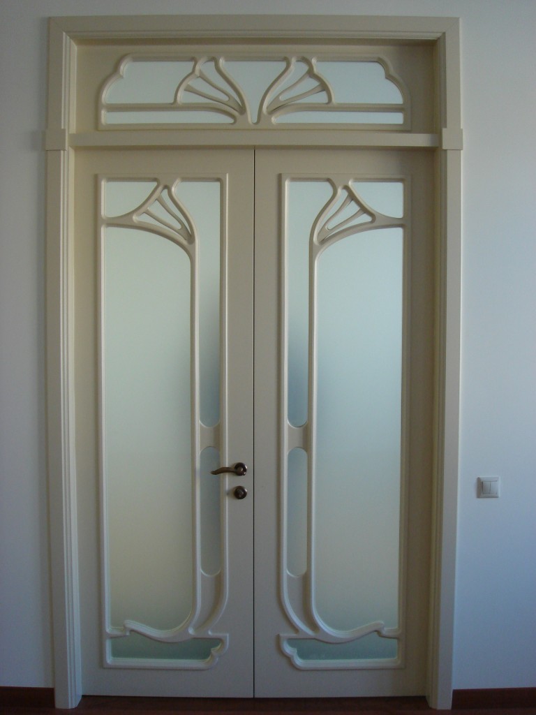4. ручного вырезания узоров, соответствующих расположению древесных волокон, а также обработки наждачной бумагой, формирующей лёгкие потёртости без повреждения нижнего слоя покрытия. На данной стадии изготовления деревянной двери с патиной важно соблюдать осторожность, чтобы не снять больше материала, чем нужно. Поэтому декорирование занимает немало времени, требует применения специальных инструментов и определяет немалую стоимость продукта.