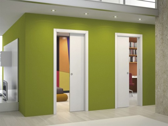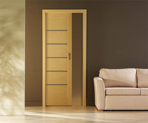 Подобное сооружение фиксируется в стене, после чего частично зашивается гипсокартоном. Закрытая ниша образует парковку, в которой прячется полотно в состоянии покоя. Одностворчатые двери-пенал комплектуются ручками, магнитными или сантехническими замками и другими элементами при необходимости.