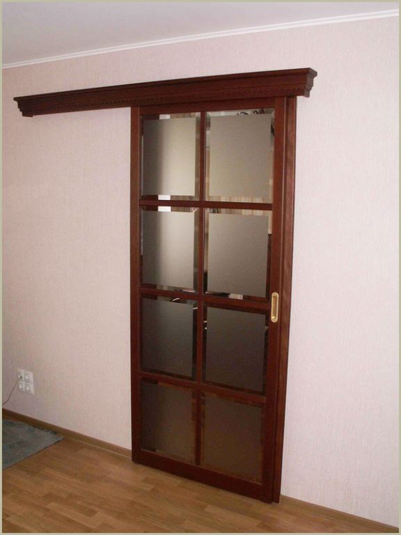- купе. Смысл купить такую подвесную дверь в кухню есть, если рядом с проёмом предусмотрена ничем не занятая стена. Створка, которая скользит поверх прохода, не позволяет устанавливать какие-либо предметы вплотную к ней;