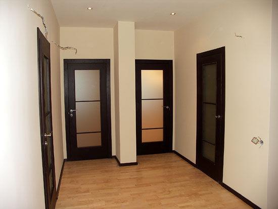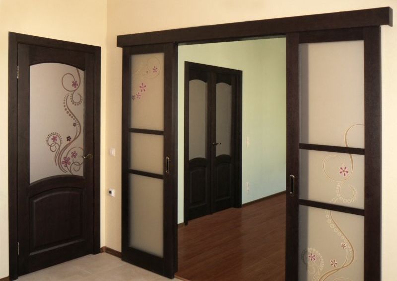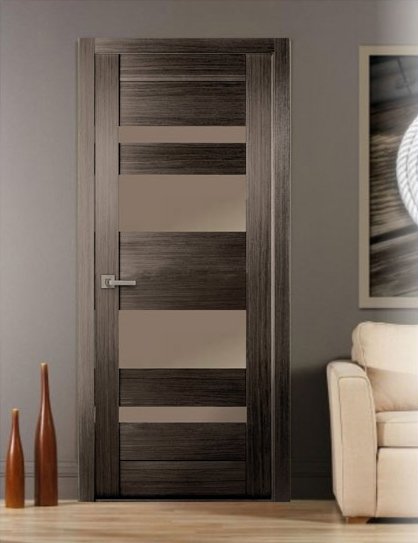 матированные по технологии пескоструя или травления. Купить тёмную дверь со стеклом, частично или полностью скрывающим обзор, - замечательный способ сберечь камерную обстановку в комнате и в то же время разгрузить её;